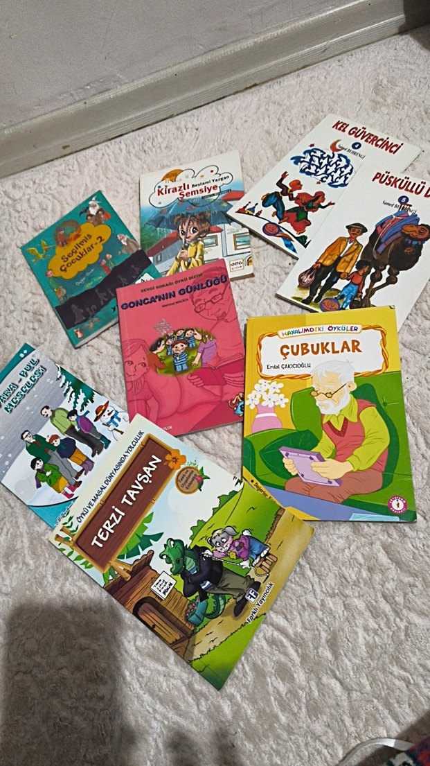 Çubuklar ve Kızıl Şemsiye gibi çeşitli hikayeler içeren, renkli çizimlere sahip çocuk kitapları seti.