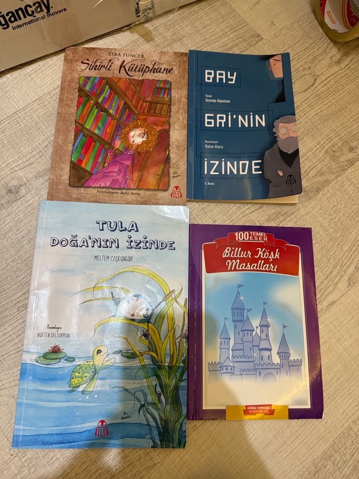 Renkli resimlerle dolu dört çocuk kitabı seti; masallar ve macera hikayeleri içerir. Kitaplar: 'Sihirli Kütüphane', 'Bay Gri'nin İzinde', 'Tula Doğanın İzinde' ve '100 Temel Masallar'. Adet fiyatıdır