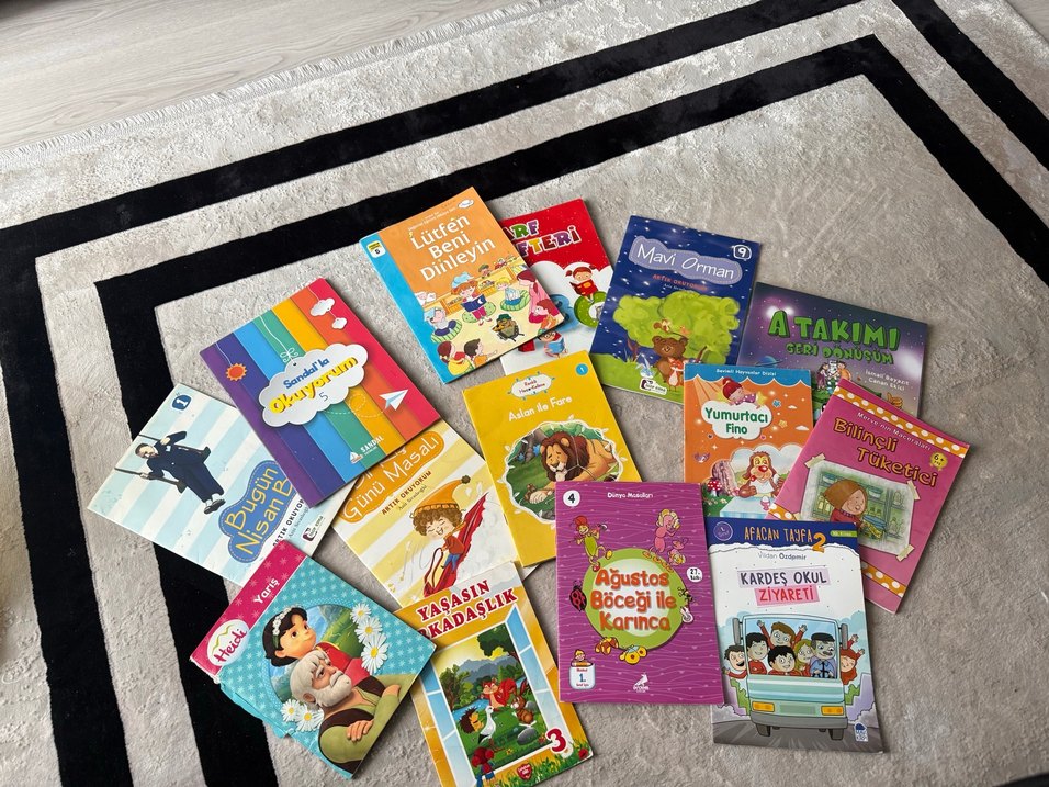 "Lütfen Beni Dinleyin," "Ağustos Böceği ile Karınca" ve "Kardeşin Ziyareti" gibi hikayeler içeren renkli çocuk kitapları seti. Heidi defo mevcut ve Harf Defterinde kullanılmış yerler mevcut