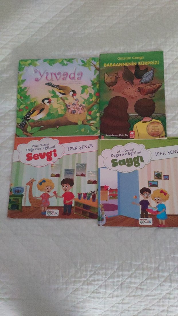 İpek Şener'in 'Sevgi' ve 'Saygı' kitapları ile 'Yuvada' ve 'Babaannenin Sürprizi' öykü kitaplarından oluşan çocuk kitapları seti.