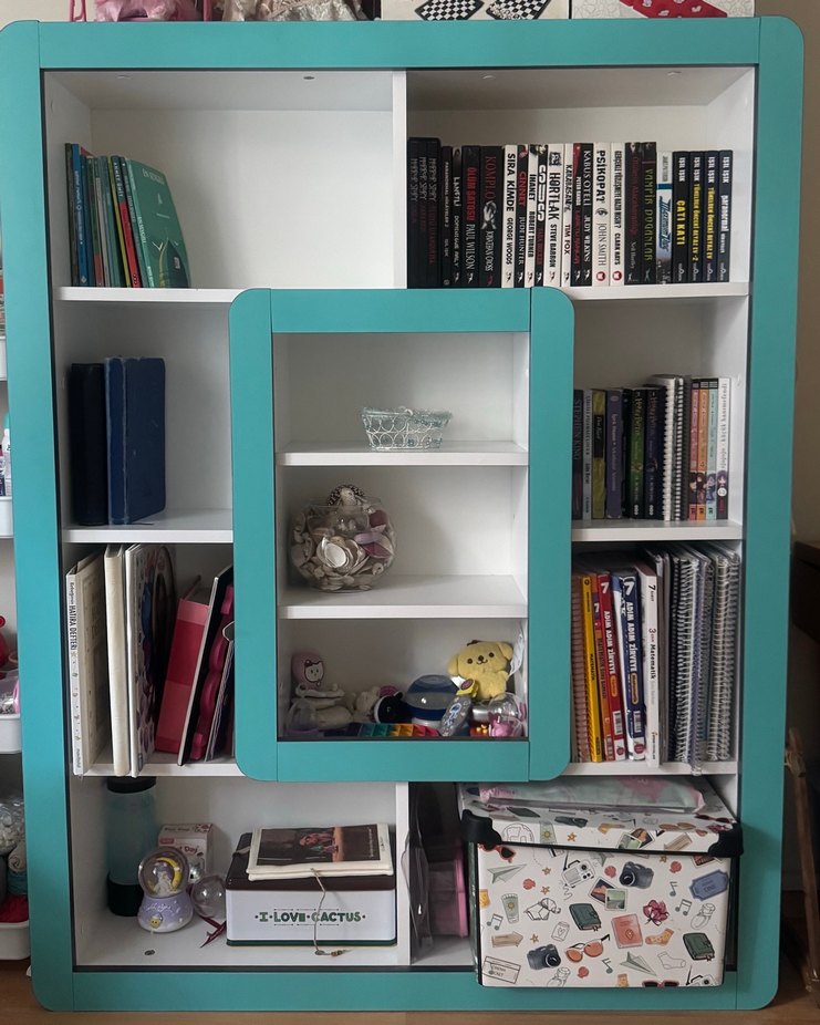 Beyaz ve Pastel tonlarda turkuaz renkli, kitap ve oyuncaklar için çok bölmeli çocuk kitaplığı Orjinalinde arkasında kontrplak bulunmamaktaydı kitaplar düşmemesi için kapattırdım.