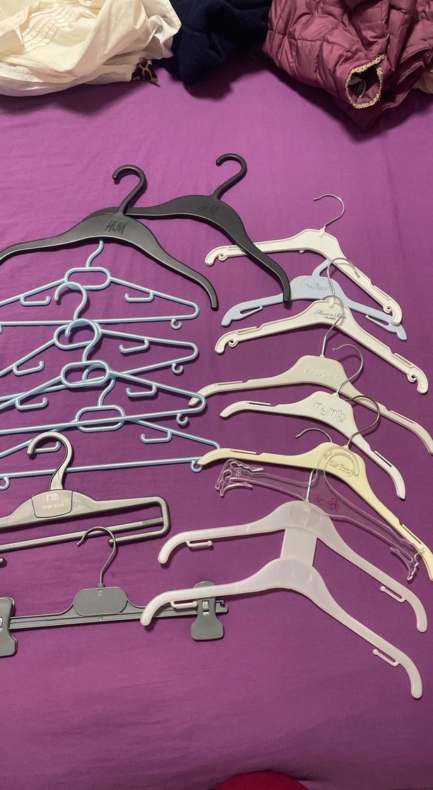 Gri ve mor tonlarında çeşitli askılar, farklı kıyafet türleri için uygun. Plastik ve metal kancalar içerir. Çocuk kıyafeti için
