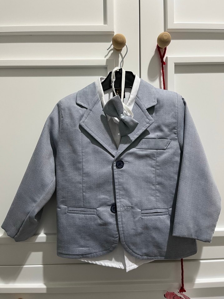 Gri renkte, düğmeli ve uzun kollu çocuk takım elbisesi. Modern klasik tarzda, kesimi rahat. 1 kere düğünde giyildi. Bedeni 3 yaş. Papyon, gömlek, pantolon ve ceket dahil.