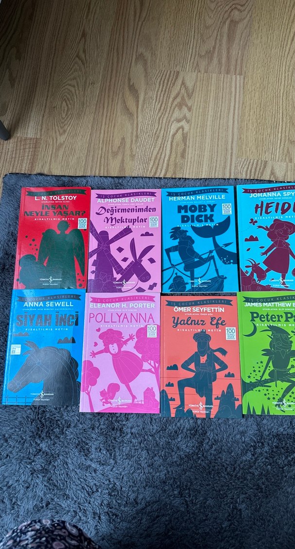 Renkli kapaklı, L. N. Tolstoy ve Herman Melville gibi yazarların eserlerini içeren 8 klasik çocuk kitabı seti.