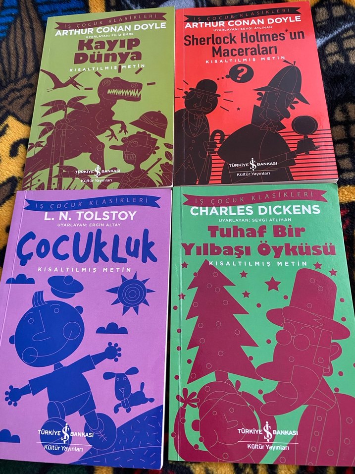 Arthur Conan Doyle, L.N. Tolstoy ve Charles Dickens'ın kısaltılmış metinlerinden oluşan 4 kitaplık çocuk klasikleri seti. Kitaplar arasında "Kayıp Dünya", "Sherlock Holmes Maceraları", "Çocukluk" ve "Tuhaf Bir Yılbaşı Öyküsü" bulunur.
