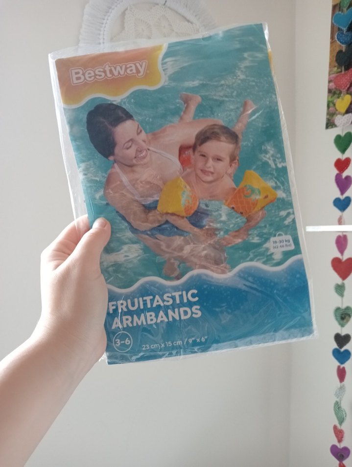 Bestway Meyveli turuncu kolluklar 3-6 yaş çocuklar için 23x15 cm boyutunda, su içinde destek sağlar.