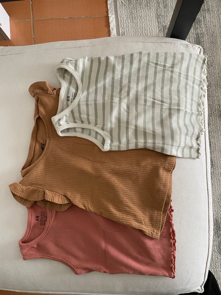 Çocuklar için açık kahverengi, yumuşak pembe ve açık çizgili renklerde üçlü kolsuz atlet paketi. Bazı kenarlarda hafif fırfır detayları bulunur.