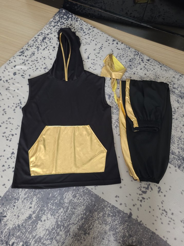 Kolsuz, kapüşonlu üst ve kemerli mini boy altı olan, altın detaylı koyu renk sentetik kumaştan yapılmış kostüm. 8-9 yaşa uygundur. Sadece bir kez giyildi, temiz ve sorunsuzdur.