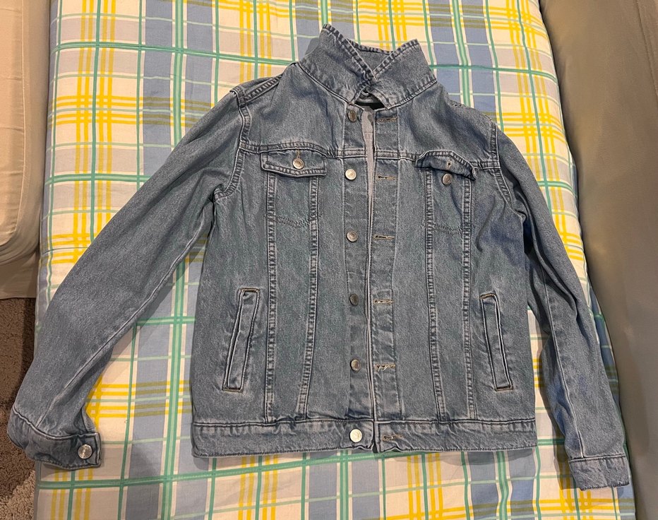 Gri renkte, düğmeli ve notalı yaka detaylı salaş kesim kadın kot ceket. Uzun kollu ve midi boyda, günlük sokak stili için uygun.