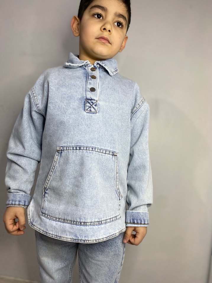 Mavi-gri batik desenli, yumuşak kot kumaştan yapılmış geniş kesim erkek sweatshirt. Düğmeli plaka, uzun kollu ve yakalıdır, ön cep içerir. Trend sokak stili için uygundur. 2-3 ve 7-8 yaşlar mevcuttur. Yeni ve etiketlidir