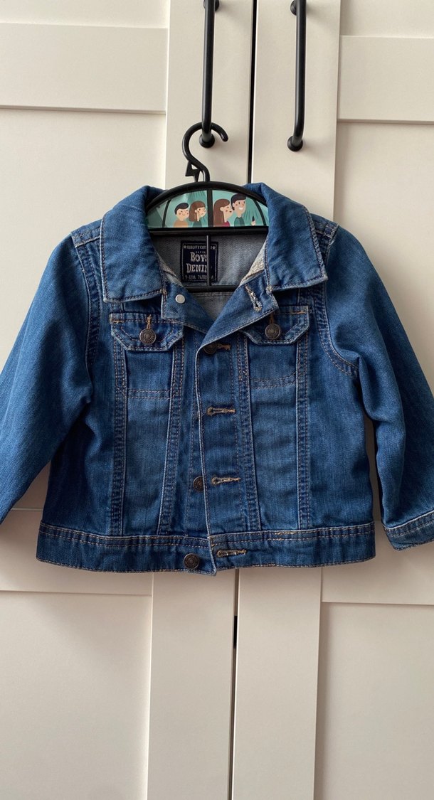 Koyu mavi kot kumaştan, düğmeli ve yakası kesik detaylı, sokak modasına uygun oturan unisex spor model 9-12 ay çocuk ceketi.