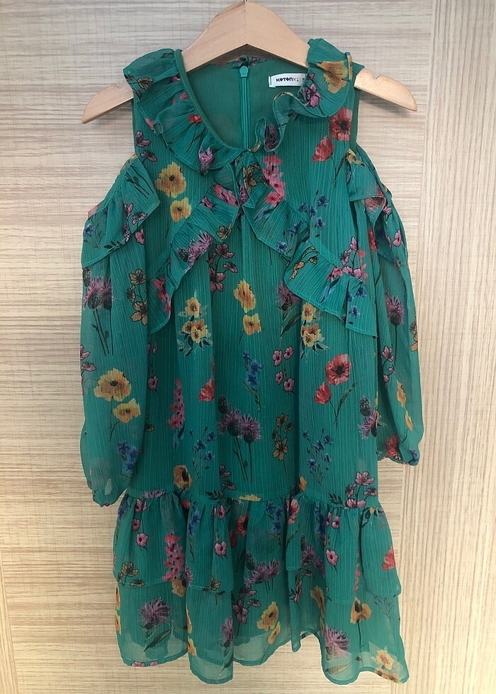 Temizdir. 4-5 yaş şifon elbise kolları açık detaylı çok şık elbise.Heryerde giyilebilir. Hiç bir sorunu yoktur