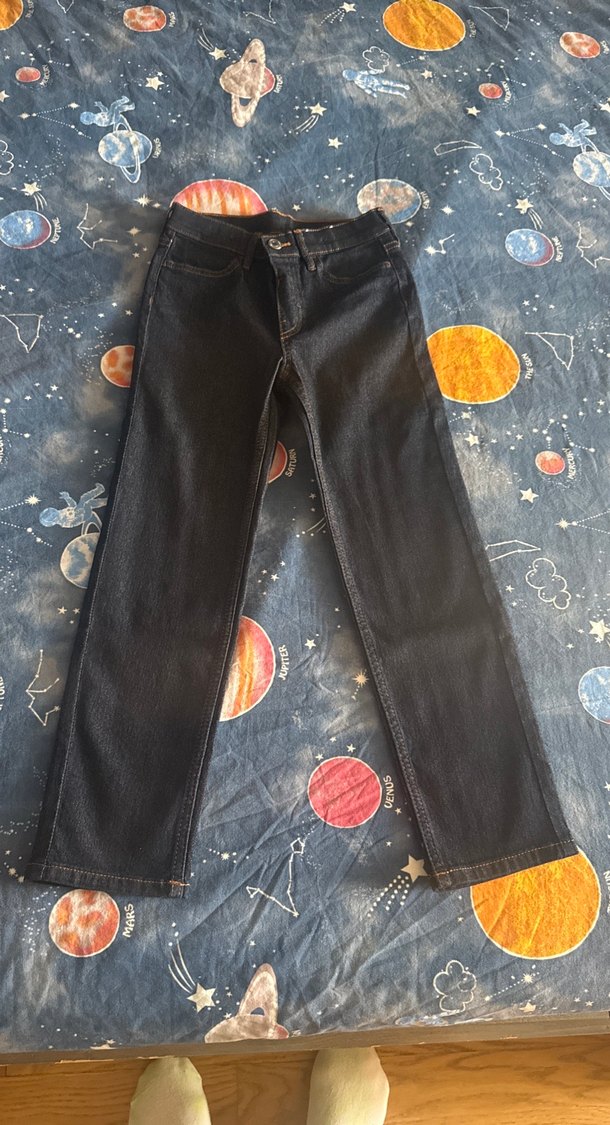 Koyu Mavi denim, slim fit, likralı esnek çocuk jean. Hiç kullanılmadı, etiketi yok ancak resimde bel kısmında etiketin ipliği duruyor. Kendi sitesinde fiyatı 699₺