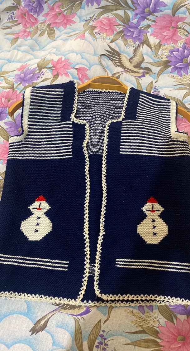Kız ve erkek çocuklar için dar kesim, lacivert örgü yelek, nakışlı kardan adam desenleri ve yuvarlak yaka, kolsuz ve süslemeli kenar detaylarıyla.