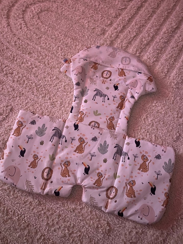 Yumuşak ve sıcak kumaştan yapılmış, beyaz renkli ve hayvan desenli çocuk mama sandalyesi minderi.