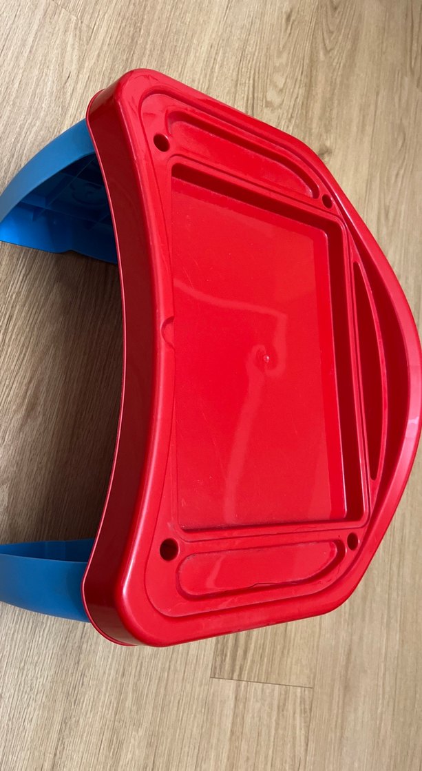 Kırmızı tepsili ve mavi ayaklı, çocuklar için otururken resim yapma rahatlığı için Resimde görünen kırık sökme esnasında olmuştur Sert ve sağlam olduğu için kullanıma sıkıntı değil defosu belli iade kabul etmiyorum