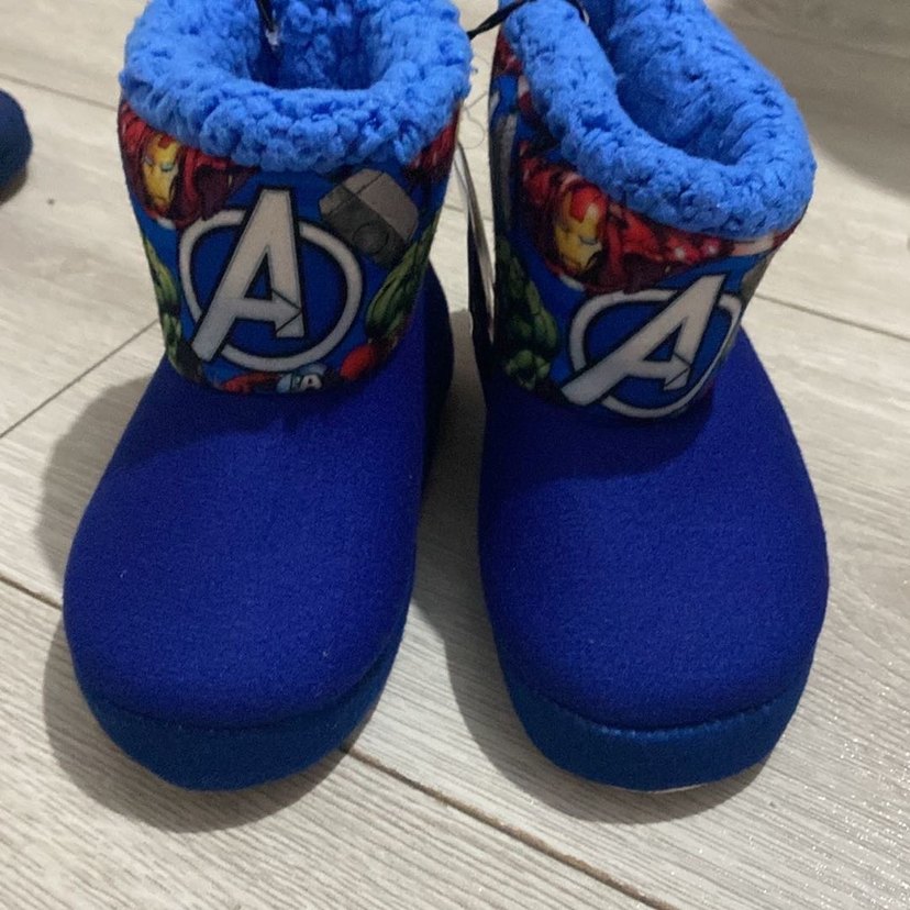 Çocuklar için mavi tüylü kumaştan yapılmış, renkli Avengers baskılı ve kolay giyilen Velcro kapamalı sıcak terlikler. ♂️