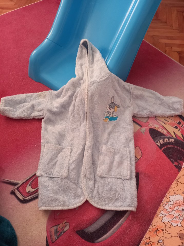 Yumuşak ve sıcak kumaştan yapılmış, kapüşonlu cocuk bornoz. İki ön cepli ve göğsünde baskılı çizgi film deseni bulunur. kemeri yok