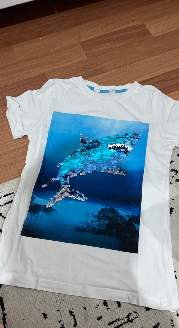 Pamuk kumaştan, kısa kollu ve bisiklet yakalı çocuk tişörtü, mavi köpekbalığı baskısıyla şık ve rahat bir sokak tarzı sunar.