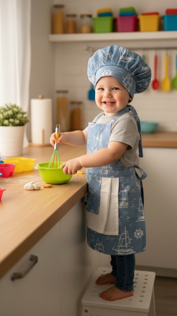 Beyaz denizcilik desenleri ve ön cepli mavi mutfak önlüğü ile uyumlu bone seti. Rahat ve kullanışlıdır. ⚓