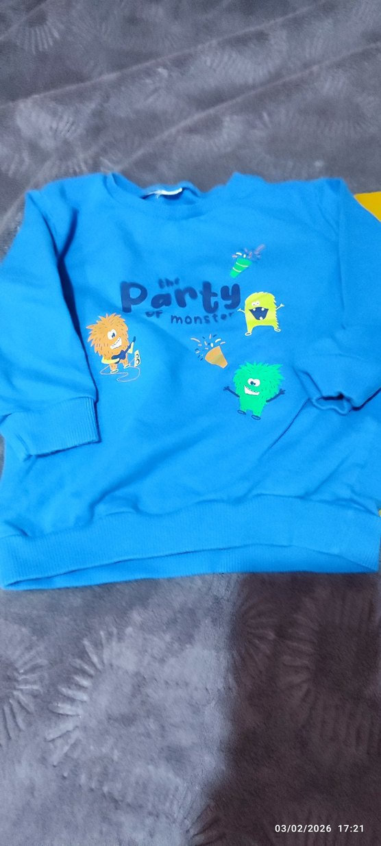 Çocuk sweatshirt, uzun kollu ve yuvarlak yakalıdır. Renkli canavar baskılı, bol kesim ve yumuşak, sıcak kumaştan yapılmıştır.