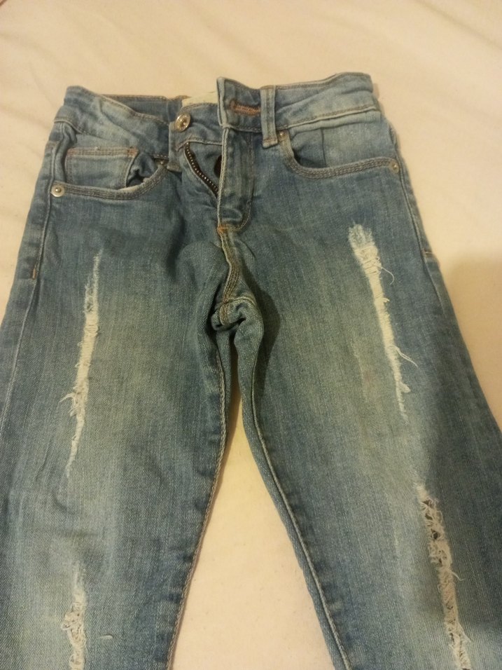 Dar kesim çocuk kot pantolon, parlak mavi renkte ve kemerli detaylıdır. Sokak stiline uygun, yıpranmış görünümlüdür.