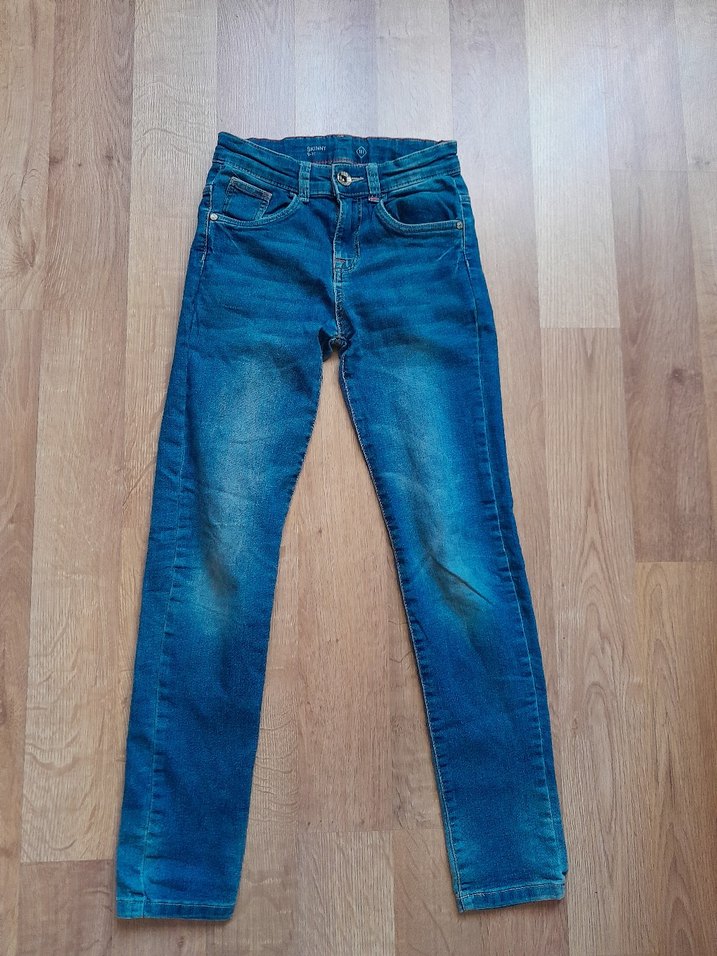 çocuklar için mavi denim, regular fit ve düğmeli pantolon. esnetmeden Beli 30 cm, boyu 85 cm. temiz. ince pamuklu kot kumaşı. 9-10 yaş etiketi