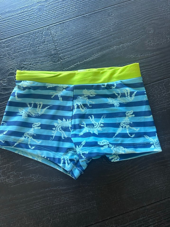 Mavi çizgili ve dinozor desenli çocuk mayo şortu, canlı sarı bel lastiği ile. Yaz su aktiviteleri için uygundur.