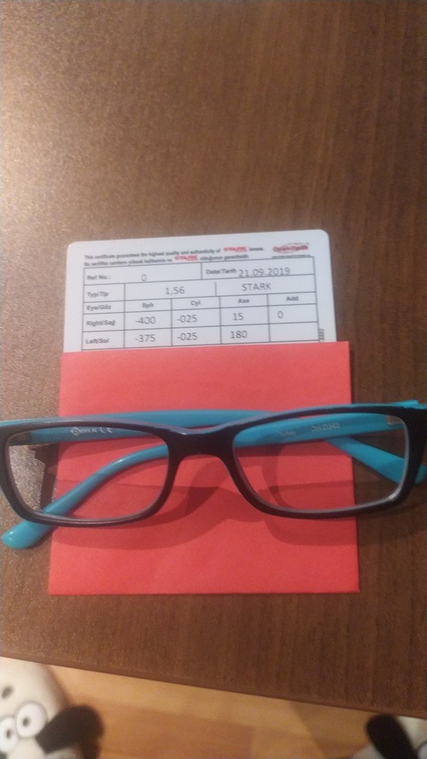 Elastik saplı, çağdaş minimalist tasarımlı mavi çocuk gözlüğü. Lens özellikleri: sphere -4.00 ve -3.75, cylinder -0.25, axis 15 ve 180, 1.56 indeksli.