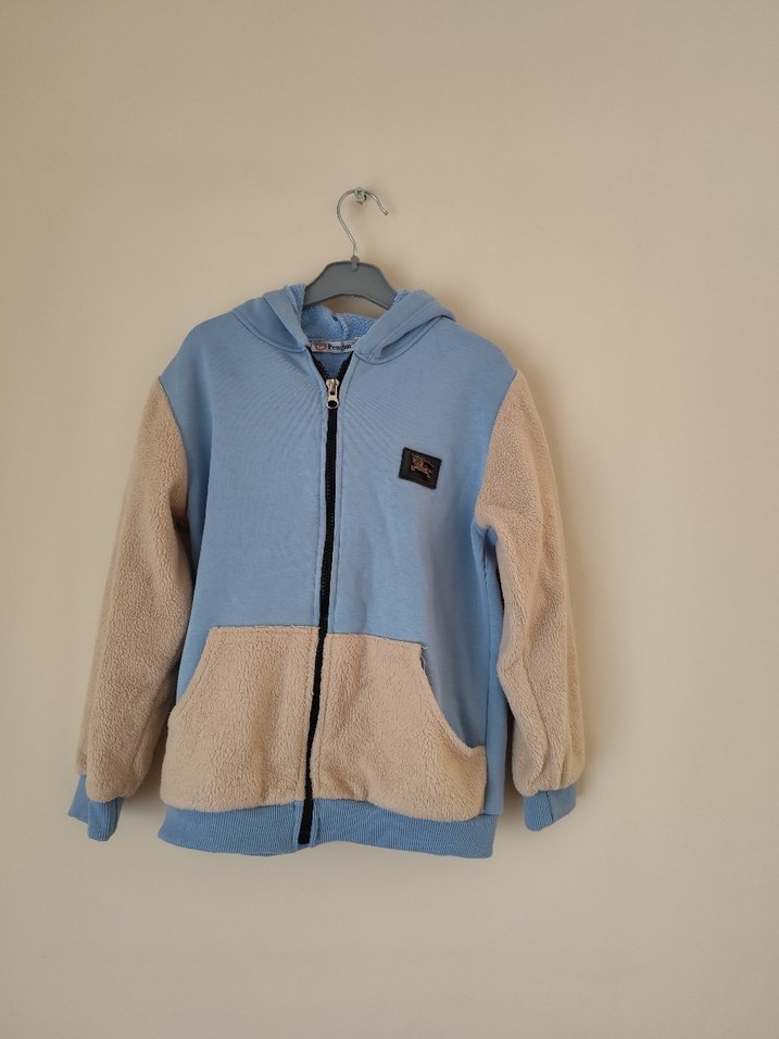 Kapüşonlu, fermuarlı, mavi ve bej tonlarında, yumuşak ve sıcak kumaştan, rahat içi polarlı, sıcacık tutan sweatshirt. 5-6 yaşa uygundur, çocuğun kilo durumuna göre değişir 7 yaş da giyebilir.