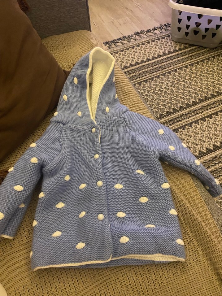 Uzun kollu, kapüşonlu ve örme kumaştan yapılmış bol kesim çocuk hırkası. Mavi zemin üzerinde beyaz benek detayları bulunur, sokak stiline uygundur.