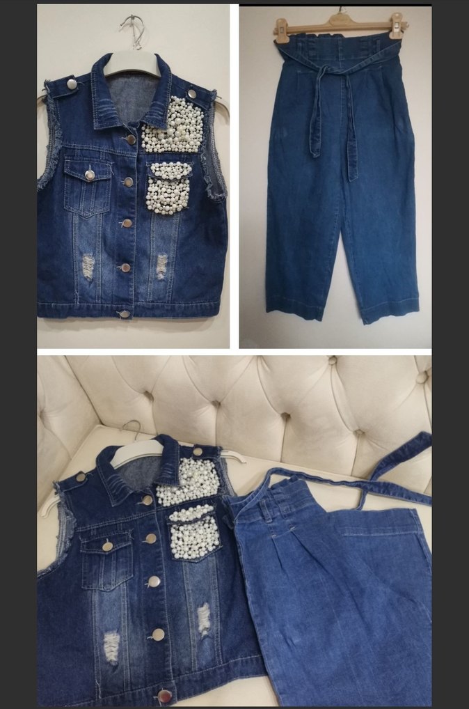 Kız çocuklar için koyu mavi, payetli ve yıpranmış detaylı kolsuz denim yelek ile kemerli yüksek bel kot pantolon takımı. Yelekte yakalı ve incili desen bulunur.