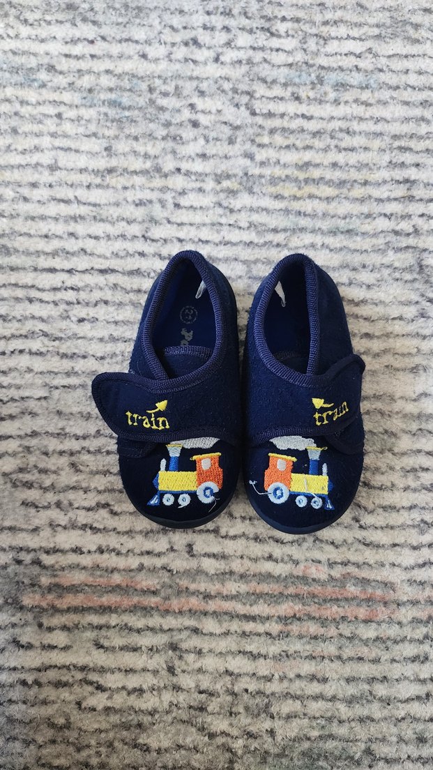 Çocuklar için nakışlı renkli tren desenli, cırt cırtlı, kauçuk tabanlı ev ayakkabısı. Az kullanıldı herhangi bir defosu yok.