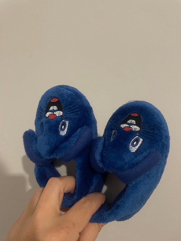 Koyu mavi polar kumaştan, nakışlı desenli çocuk ev terliği, rock punk tarzına uygun.