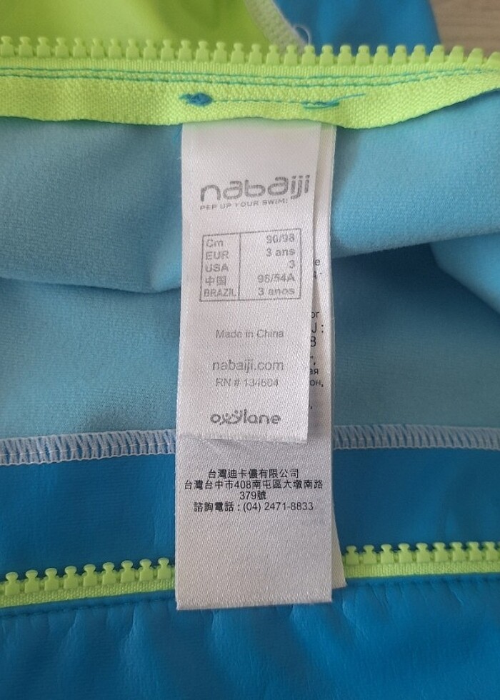 Decathlon marka sağlam Mayo giysi 3 yaş beden bilgileri resimde vardir.