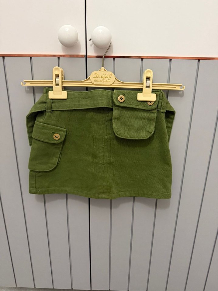 Kemerli ve düğmeli iki cepli, yumuşak süet kumaştan yapılmış, koyu haki renkli, dar kesim kadın mini eteği. Casual dış mekanlar için uygundur.