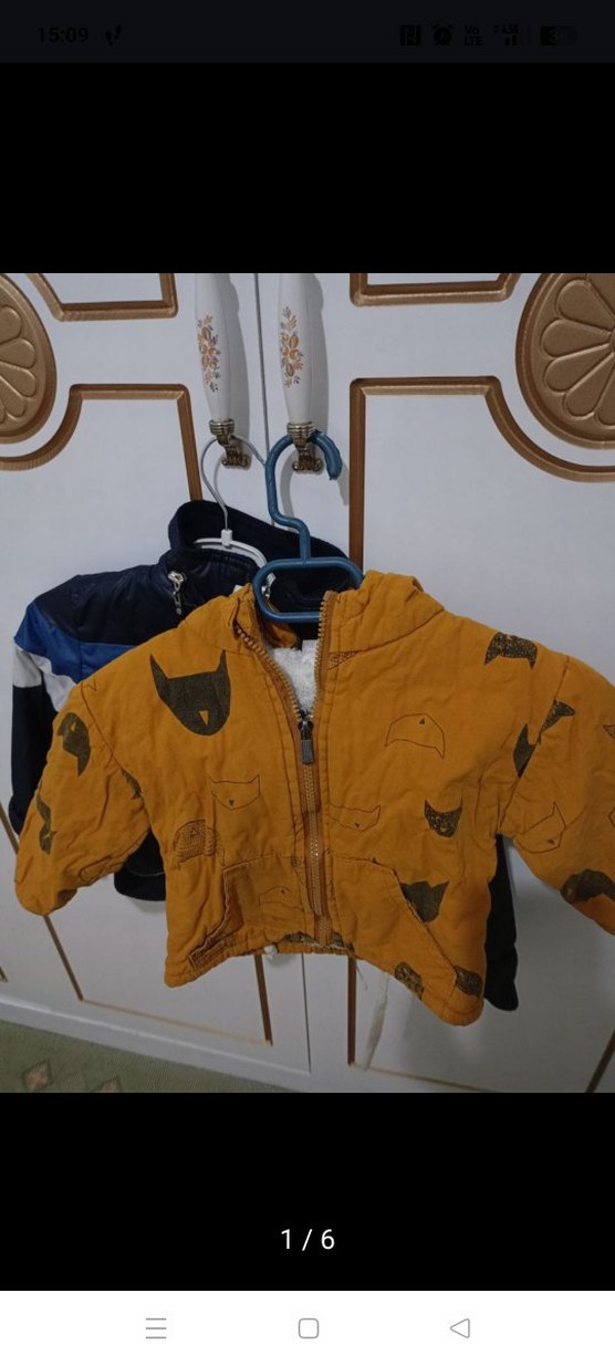 az kulanılmış 2 tane çocuk mont. Kapüşonlu ve fermuarlı, bol kesim erkek çocuk ceketi. Yumuşak ve sıcak kumaştan, sarı renkte ve desenli, sokak stili için uygun.