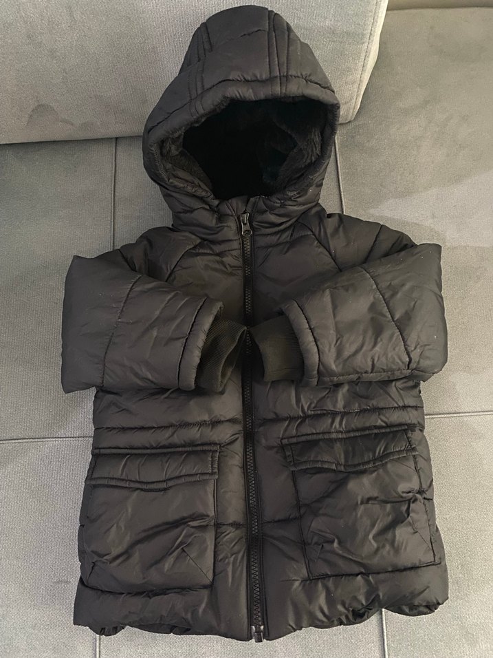Erkek çocuk için Siyah hafif şişme mont fotoğrafta gri gibi çıkmış. kapüşonlu, içi full kürklü ve yumuşak. Sıkıntısı yoktur. 3-4 yaş