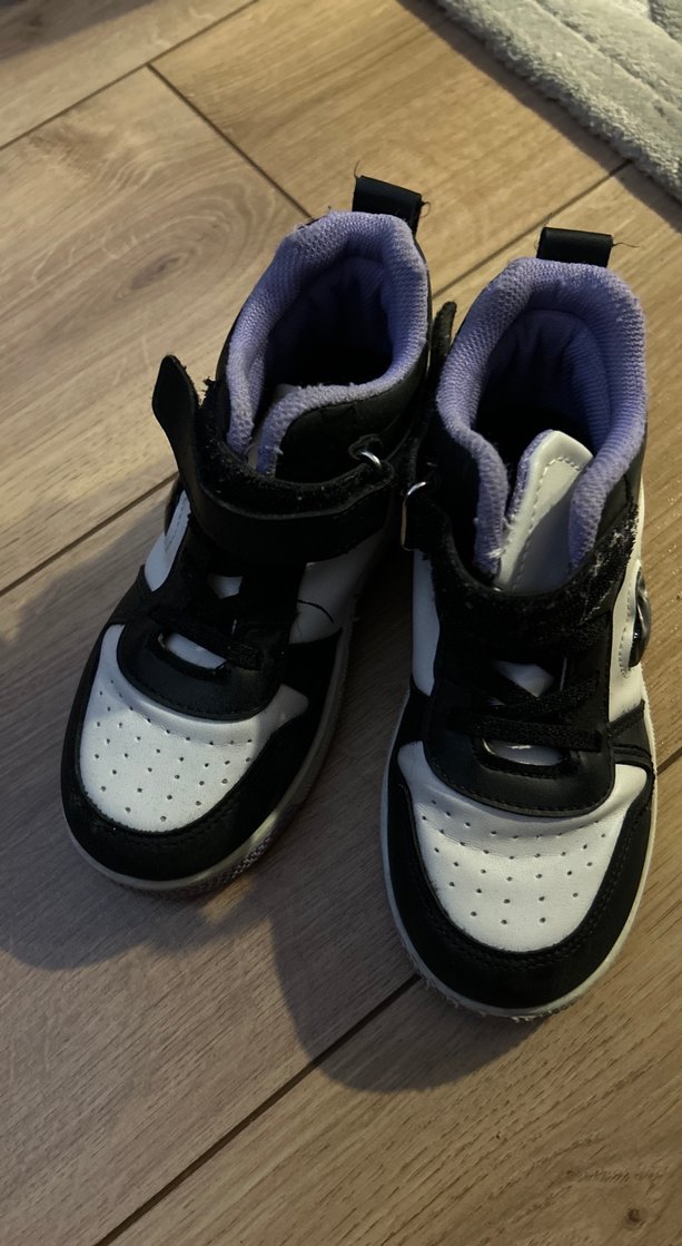 mor ve siyah renklerde, kauçuk tabanlı spor ayakkabılar. Cırt cırtlı kapanışıyla kolay kullanım sunar, ışıklıdır