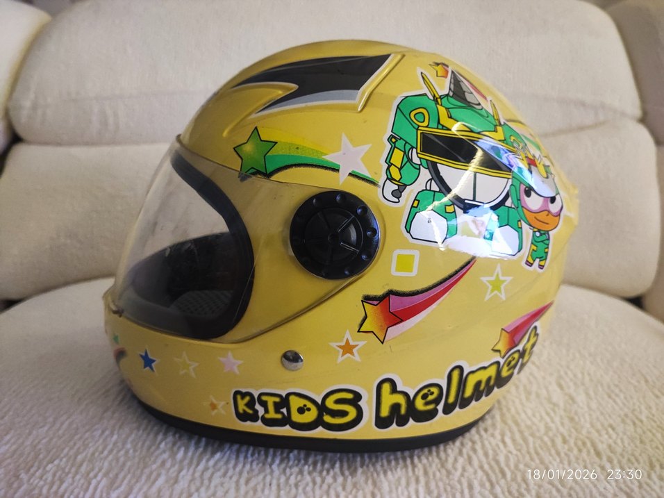 Kızımın dört beş kez kullandığı Sarı motosiklet kaskı, renkli baskılar ve tokalı kapanış ile. Canlı, punk esintili tasarıma sahip.