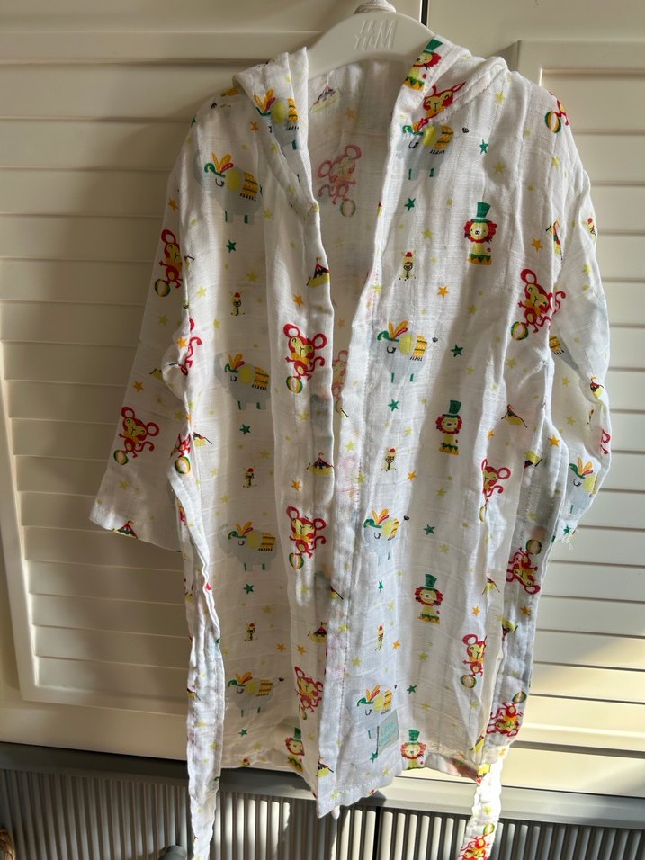 Kapüşonlu, kemerli, renkli baskılı desenlere sahip beyaz müslin kumaştan çocuk bornozu.
