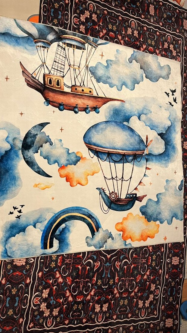 Bu çocuk halısı, koyu zemin üzerinde renkli hava gemileri, bulutlar ve gökkuşağı baskısına sahiptir.