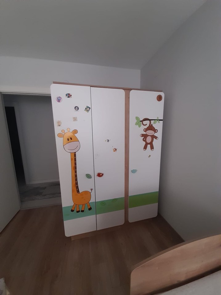 Kahverengi tonlarında, kapılarında zürafa ve maymun figürleri bulunan çocuk odası gardırobu, odaya neşeli bir hava katıyor.