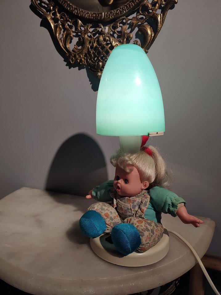 Turkuaz kıyafetli bebek figürünün yer aldığı yuvarlak tabanlı, turkuaz ışık gölgesiyle tamamlanan lamba. Yumuşak ışık ve eğlenceli tasarım bir arada. DÖNEM COCUK ODASI AYDINLATMA