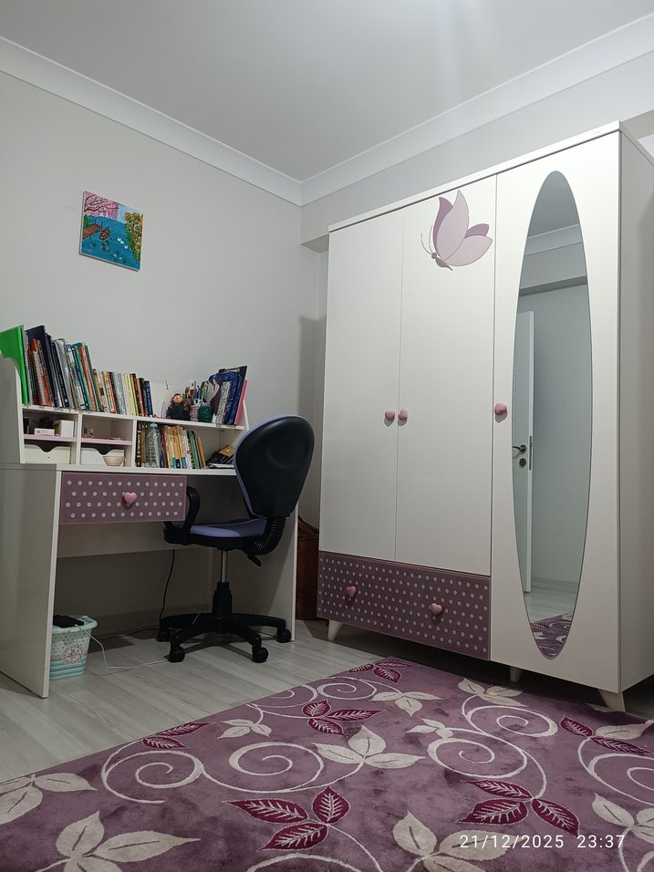 Pastel mor çocuk dolabı ve çalışma masası seti, oval aynalı dolap ve depolama bölmeli masadan oluşur. Kelebek ve kalp detayları ile uyumlu halı içerir.