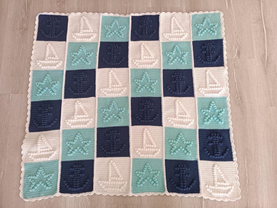 Çocuklar için örme battaniye, açık mavi, lacivert ve beyaz karelerde kabartmalı tekne, yıldız ve çapa desenleri içerir. İstenilen renk, ebat ve fiyat bilgisi için lütfen mesaj atınız