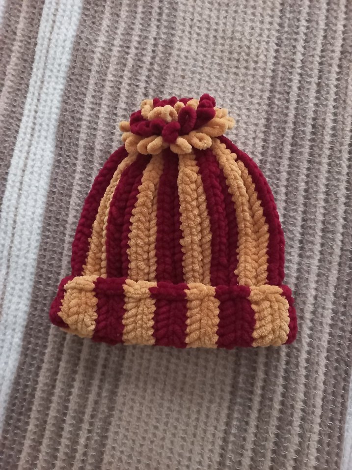 Koyu kırmızı ve sarı renklerde çizgili, örgü bere. Yumuşak ve sıcak tutan bohem tarzda örülmüştür.