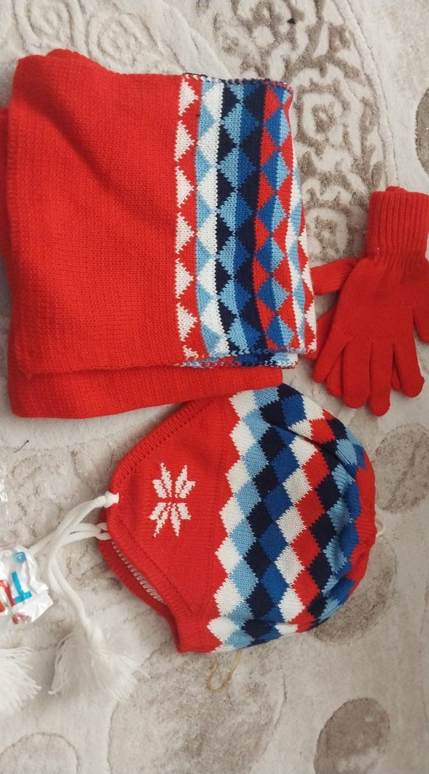 Renkli çocuk örgü seti; nakışlı bere, atkı ve eldiven içerir. Bohem tarz için uygun. 1 takım fiyatıdır