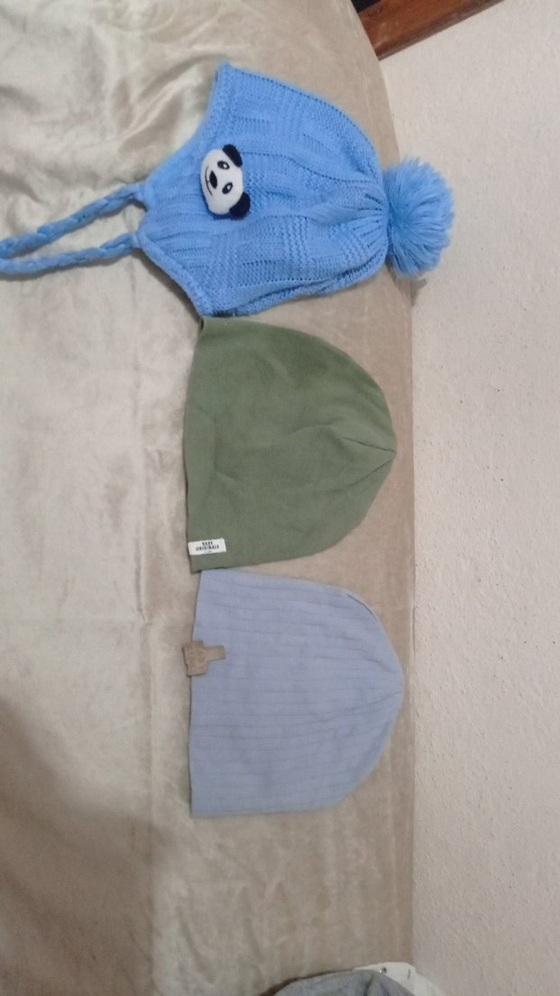Yumuşak örgü kumaştan üç çocuk beresi seti. Mavi bere ponponlu ve panda detaylı, diğerleri yeşil ve açık gri düz renktedir.