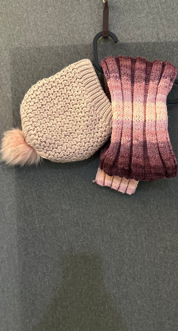 Pembe örgü bere ve pembe-gri tonlarda ribanalı atkıdan oluşan sade, bohem tarzda çocuk seti. Atkı 130 cm Bere 20 cm